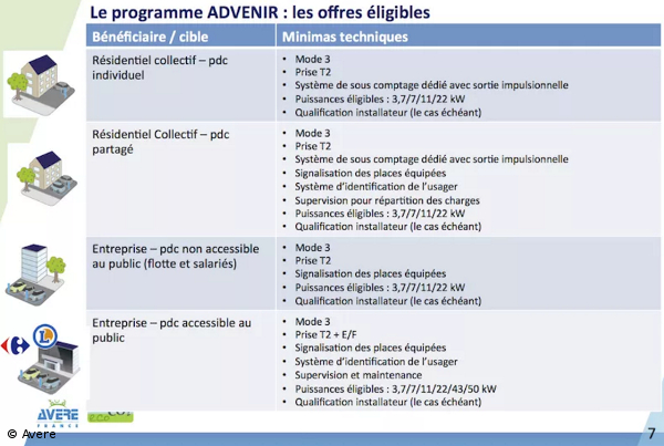 Officialisé par la signature de Ségolène Royal le 10 février dernier, la convention relative au programme « Aide au Développement des Véhicules Électriques grâce à de Nouvelles Infrastructures de Recharge », doit permettre l’installation de plus de 12 000 points de recharge privés d’ici la fin 2018 : 6 300 points de recharge pour les entreprises et 5 700 points de recharge pour les particuliers (résidentiel collectif uniquement). Le Programme ADVENIR, porté par l’Avere-France, soutenu par EcoCO2, l’Ademe et l’État sera financé via des certificats d’économie d’énergie (via ces certificats, EDF financera à hauteur de 9,75 millions d’euros HT ce programme).