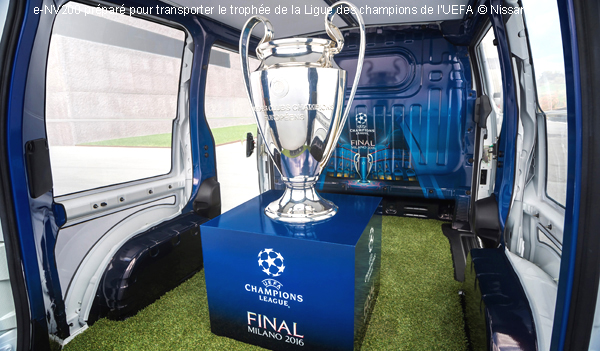 C’est comme partenaire automobile officiel de la compétition européenne de football la plus suivie que Nissan mettra à disposition une telle flotte branchée qui devra assurer différents rôles, dont celui de transporter des invités et officiels venus le prochain week-end pour assister à la finale. Mais dès demain, jeudi 26 mai 2016, un fourgon e-NV200, dans une livrée spécialement réalisée pour l’événement, convoiera et exhibera le trophée de la Ligue des champions de l’UEFA jusqu’à la « fan zone » située devant le Dôme de Milan, c’est-à-dire devant la cathédrale de la Nativité-de-la-Sainte-Vierge, sur la piazza del Duomo. La coupe et son écrin branché y resteront jusqu’au jour du grand match. Samedi 28 mai, c’est une Leaf qui apportera le prix au stade Giuseppe Meazza, dans le cadre de la Tournée du Trophée.