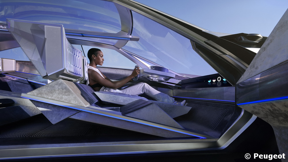Outre son nouvel i-Cockpit, l’Inception Concept propose une vision inédite de l’intérieur pour une grande routière. Ainsi, il crée de nouvelles postures d’assises, plus allongées, en accord avec les nouvelles architectures « BEV-by-design ». La ceinture de caisse haute agit comme un renfort sécuritaire apaisant. Le rang 1 se projette vers l’avant et offre une vision de la route exceptionnelle. Le rang 2 profite d’une vision extérieure poussée à son paroxysme, grâce aux surfaces vitrées généreuses et aux nouvelles proportions des sièges. Des proportions avec plus de largeur et une assise qui s’adapte à la morphologie de chacun des passagers. D’autre part, chaque matériau de l’habitacle a été traité en fonction de leurs reflets. Ainsi, la teinte à l’intérieur du véhicule évolue en fonction de l’environnement et varie selon la lumière qui nous baigne.