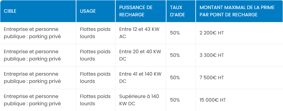 Sont éligibles à la prime Point de recharge ouvert au public sur parking privé à destination des véhicules poids lourds toute entreprise ou personne publique pour une station de recharge à destination de véhicules poids lourds située dans une aire logistique telles que définies par le SDES* ou dans un rayon de 3 km autour de celles-ci.