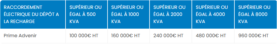 Les montants de prime sont calculés par rapport au raccordement au réseau électrique réalisé sur chaque dépôt et se déclinent en différents niveaux d’exigences techniques.