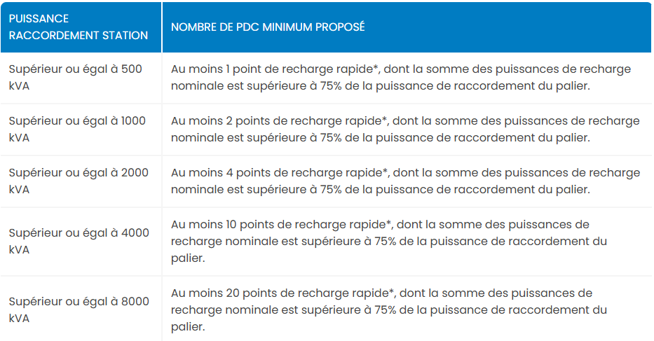 Pour les déploiements supérieurs à 500 kVA, différentes exigences en termes de points de recharge s’appliquent en fonction de la puissance de raccordement de la station.