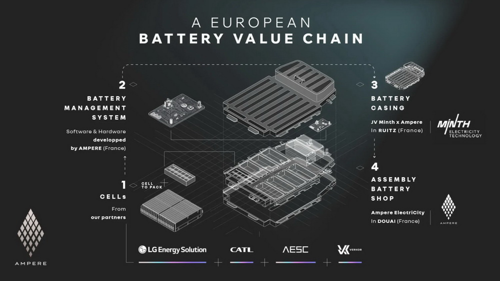 Ampere et ses partenaires ont bien l’intention de poursuivre leurs recherches sur la chimie des batteries. A moyen terme, ils travaillent au développement d’une technologie de batteries « cobalt free et silicium ». Une technologie permettant une recharge en moins de 10 minutes, avec une autonomie améliorée et des coûts maîtrisés. A plus long terme, ils proposeront une chimie à base de Lithium métal qui double l’autonomie obtenue avec le NMC pour un coût identique à celui de la chimie LFP. En parallèle, ils cherchent aussi à développer la technologie innovante « Cell-to-Pack ». Une solution permettant d’intégrer directement les cellules de type « pouch » dans le boitier de la batterie du véhicule. Un moyen d’éliminer la nécessité de modules séparés et d’augmenter le nombre de cellules dans un espace donné. De quoi accroître l’autonomie des véhicules tout en réduisant les coûts de production.