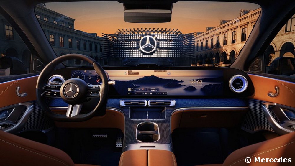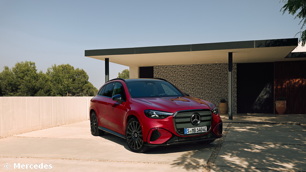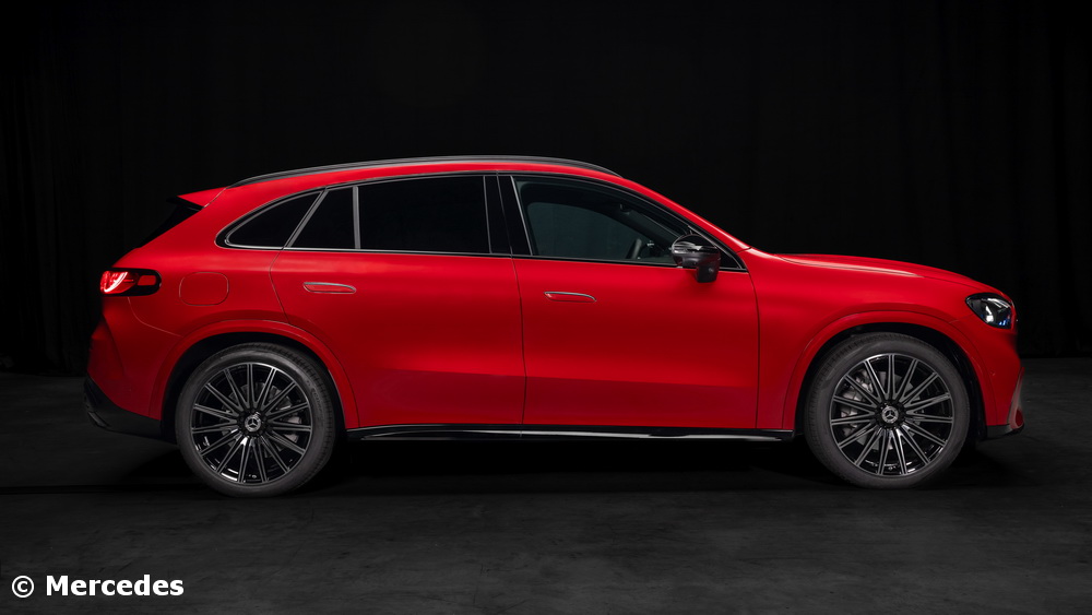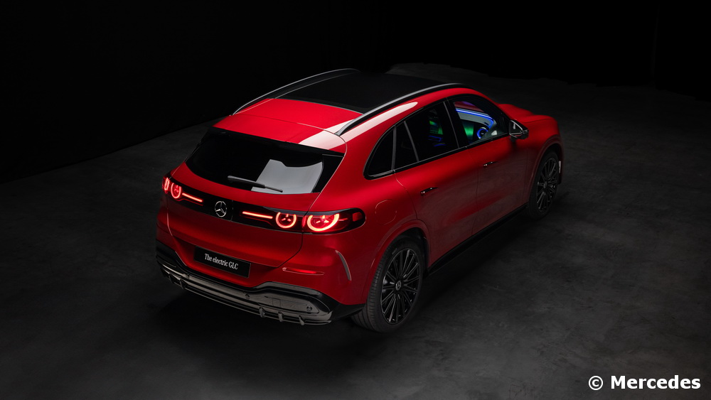 Avec ses 4,84 mètres de long, le GLC électrique s’inscrit dans la catégorie des SUV familiaux haut de gamme. Plus long de 13 cm, il adopte une ligne plus épurée que celle du modèle thermique. Il arbore aussi quelques éléments distinctifs marquants, notamment une nouvelle calandre avec un motif étoilé et un badge central illuminé. Pour Mercedes, cette calandre emblématique redéfinit le visage de la marque, dégageant prestige et caractère. Par ailleurs, la ligne de toit légèrement inclinée évoque un style coupé. Les designers ont également cherché à optimiser l’aérodynamisme. Ainsi, les jantes spécifiques et les passages de roues sculptés minimisent les turbulences. Disponibles jusqu’en 21 pouces, les grandes roues contribuent à l’efficacité énergétique tout en affirmant le style SUV premium. Enfin, à l’arrière, les feux connectés s’étendent sur toute la largeur pour une visibilité accrue.