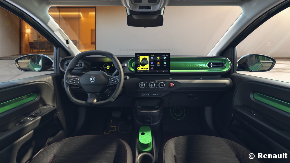 Inspirant l’optimisme, l’habitacle fait aussi ressortir l’esprit jovial de la Twingo E-Tech electric. Ainsi, le dessin cylindrique de la planche de bord colorée, qui apparait comme suspendue, crée une sensation d’ouverture. Une planche de bord sur laquelle on retrouve l’iconique bouton rouge de déclanchement des feux de détresse. Un bouton désormais encapsulée en transparence pour plus de modernité. Modernité également avec le double écran horizontal OpenR et le système multimédia avec Google intégré, une première sur ce segment. Les deux écrans de 7 et 10 pouces ne sont pas uniquement fonctionnels. Ils donnent vie à l’habitacle avec des animations et des graphismes enjoués développés spécialement pour la Twingo. Un habitacle offrant quatre vraies places et se distinguant par son habitabilité maximisée par des sièges arrière indépendants et coulissants. De quoi choisir de privilégier l’espace pour les passagers ou le volume disponible dans le coffre.