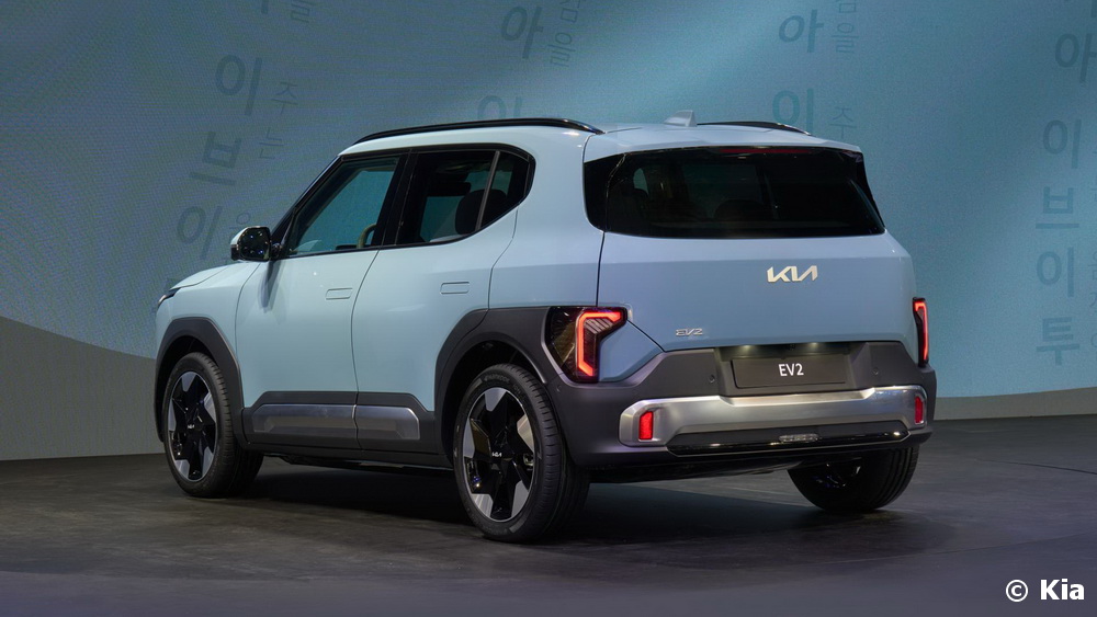 Long d’un peu plus de quatre mètres, EV2 combine un gabarit compact à des proportions robustes, idéal pour l’environnement urbain. Il incarne la philosophie de design « Opposites United » (L’alliance des contraires) de Kia. Affirmant son allure de SUV, on retrouve notamment les lignes verticales inspirées des autres modèles de la marque. Fidèle à celui du concept EV2, le design mêle des formes anguleuses à certaines rondeurs. Des feux de jour verticaux, la nouvelle signature lumineuse Star Map et une ligne d’épaule prononcée créent un extérieur distinctif. Des passages de roue noirs, sous lesquels peuvent apparaître des jantes de 16 à 19 pouces, renforcent l’allure robuste d’EV2. A l’avant, un capot horizontal contraste avec un bouclier vertical. La ligne de caisse s’étire elle jusqu’à la poupe car, positionnés très bas, les blocs optiques ne la coupent pas.