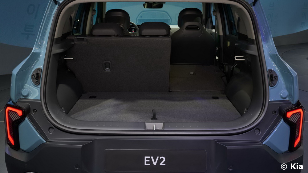 Malgré sa relative petite taille, EV2 offre une habitabilité assez remarquable grâce à la plateforme E-GMP sur laquelle il repose. Celle-ci permet en effet de renvoyer les roues aux quatre coins et d’offrir un empattement de 2,56 mètres. Cela offre aux passagers arrière un bel espace aux jambes, maximisé encore par l’absence de tunnel central. EV2 se distingue également par son extrême modularité, le rendant suffisamment pratique pour être le véhicule principal du foyer. Kia propose deux configurations, à commencer par une version 5 places avec une banquette arrière fixe. En option, la marque propose également une version quatre places avec deux sièges arrière indépendants. Inclinables et coulissants sur 17,5 cm, ces sièges maximisent la flexibilité d’EV2. Ainsi, lorsqu’ils sont avancés au maximum, ce SUV compact offre jusqu’à 403 litres de volume de coffre.