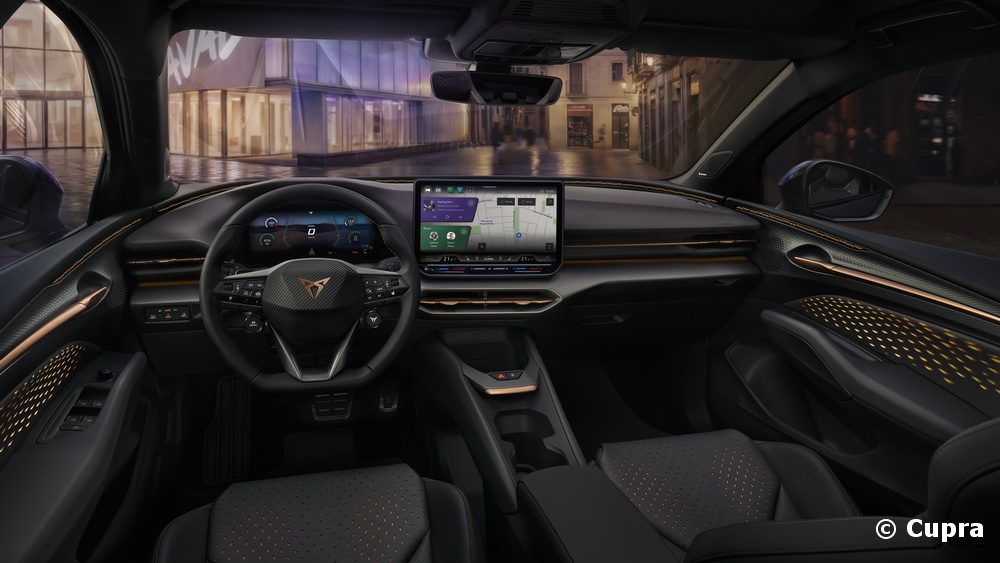 Longue de seulement 4 mètres, la Cupra Raval fait partie des berlines compactes du segment B. Néanmoins, son empattement de 2,60 m lui permet de proposer des places accueillantes à l’arrière. De plus, son coffre spacieux (441 litres) et pratique la rend étonnamment polyvalente. Conjuguant dynamisme urbain et praticité, elle est idéale aussi bien pour la vie citadine que pour les longs voyages. Centré sur le conducteur, l’habitacle se distingue par un éclairage immersif et une intégration numérique poussée. Il bénéficie notamment d’un écran d’infodivertissement de 12,9 pouces avec un nouveau système d’exploitation Android. A partir de lui, le conducteur peut contrôler tous les paramètres à bord et autour de la Cupra Raval. Un volant doté de boutons physiques et de commandes satellites garantit aussi une meilleure connexion avec le véhicule.