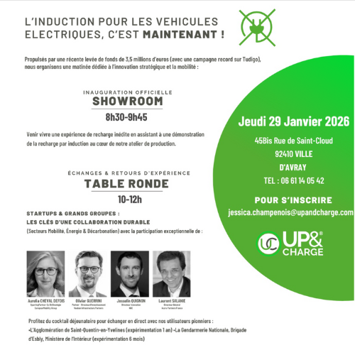 UP&CHARGE organise une matinée dédiée à l’innovation stratégique et à la mobilité le jeudi 29 janvier 2026 à Ville-d’Avray (92). Au programme : 8h30 – 9h45 : inauguration du showroom + démonstration de recharge par induction 10h – 12h : table ronde « Startups & Grands Groupes : les clés […]